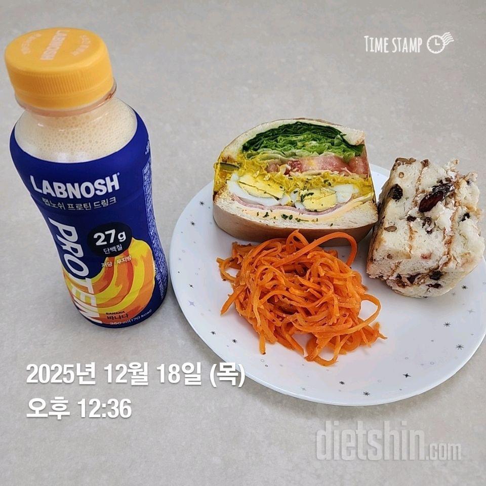 *점심 - 단백질음료, 단호박에그샌드위치, 당근라페, 코코넛견과류 카스테라