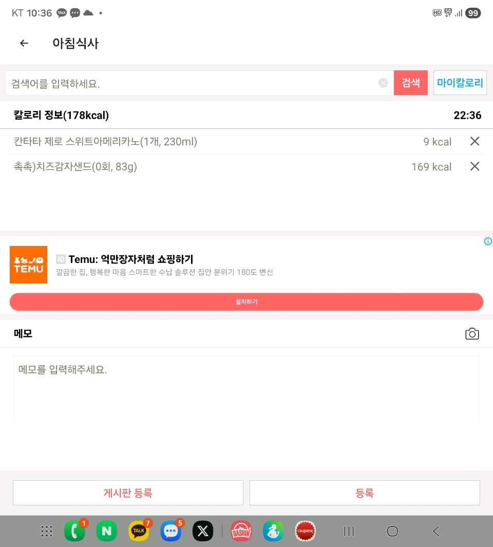 10월 08일 (음식 1713kcal, 운동 627kcal)