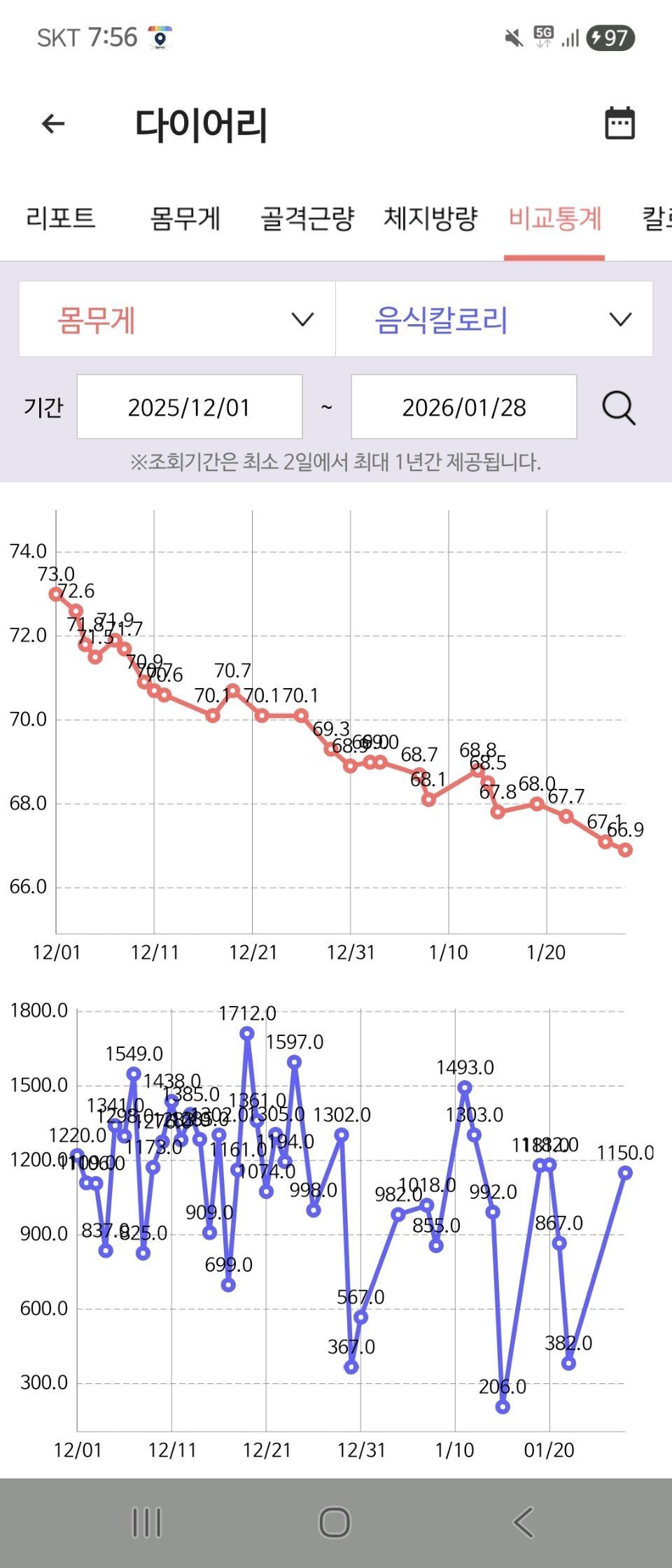 01월 28일( 운동 630kcal)