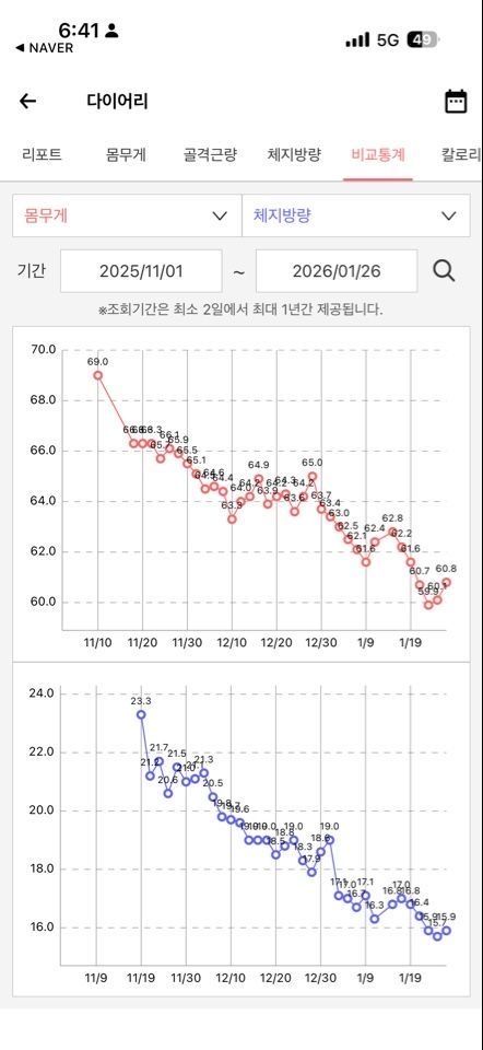 1일차 > 2일차 : -0.06kg 미비하긴 하지만 아파서 운동 못한거