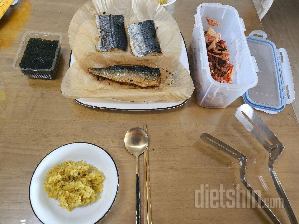 아침식사: 강황 현미밥1/2공기, 고등어구이, 삼치구이1/4조각, 광천김3장, 배추김치 조금, 아메리카노1잔