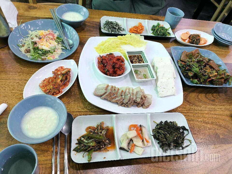 점심식사: 콩밥1/2공기, 순두부, 손두부, 멸치볶음, 버섯볶음, 녹두전 조금, 수육3조각, 고등어구이5번