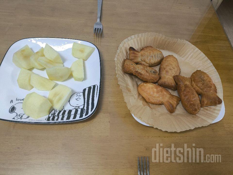 야식: 사과2조각, 슈크림 붕어빵 작은 것1개, 팥 붕어빵 작은 것2개, 디카페인 아메리카노1잔