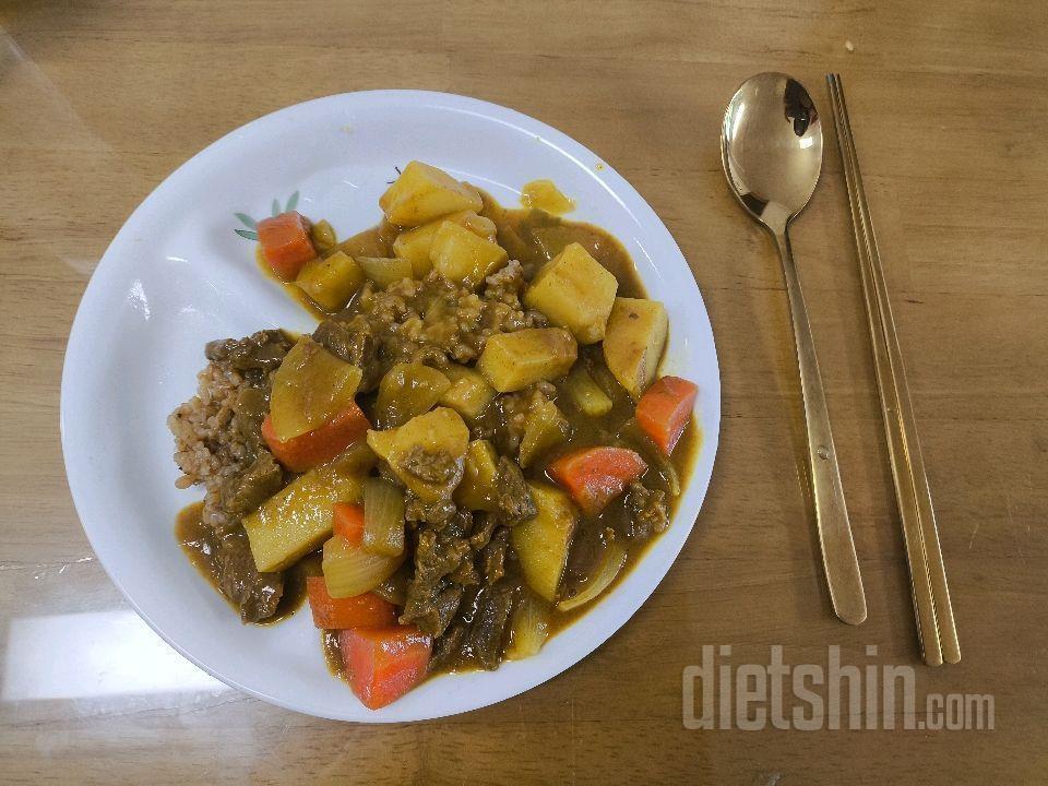 저녁식사: 발아현미밥1/2공기, 소고기 카레1인분, 프렌치카페 디카페인 스테비아 커피1잔, 구운 감자3개, 디카페인 아이스 아메리카노1잔