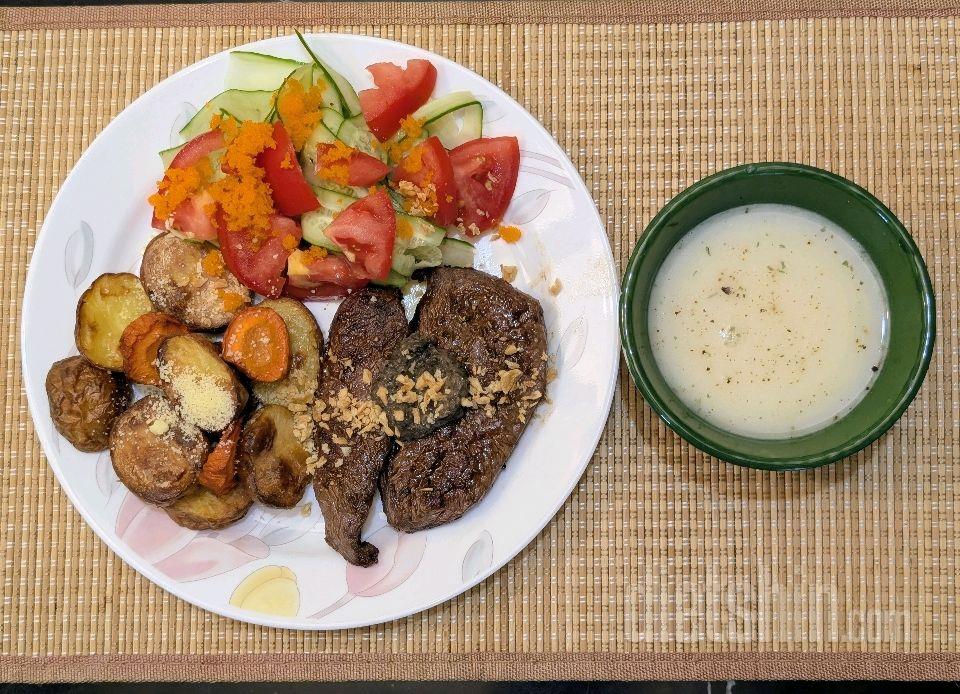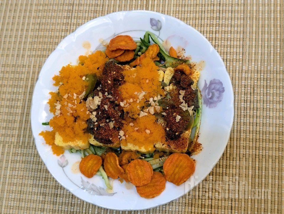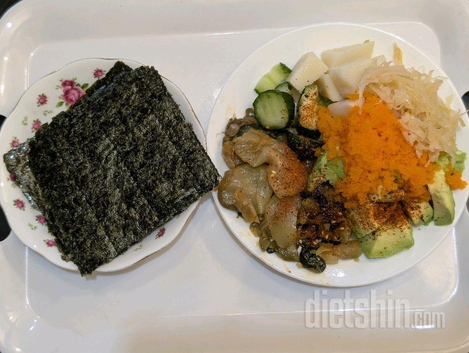 점심은 일본식 계란말이에.좋아하는 송로버섯 소스 & 날치알 토핑.저녁은 아보카도+날치알+일본나물반찬+견괴류 + 죽순 + 김(오픈한 김 처리)