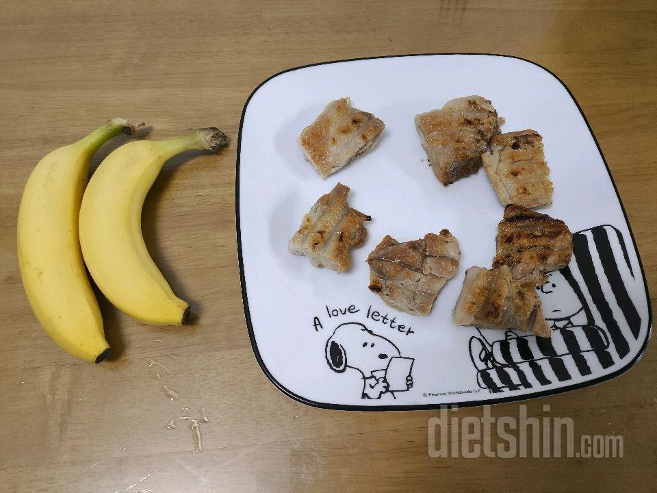야식: 바나나 작은 것2개, 순살 소금구이5조각, 메론4조각, 미니코코 크런치2/3봉, 가나초콜릿1개