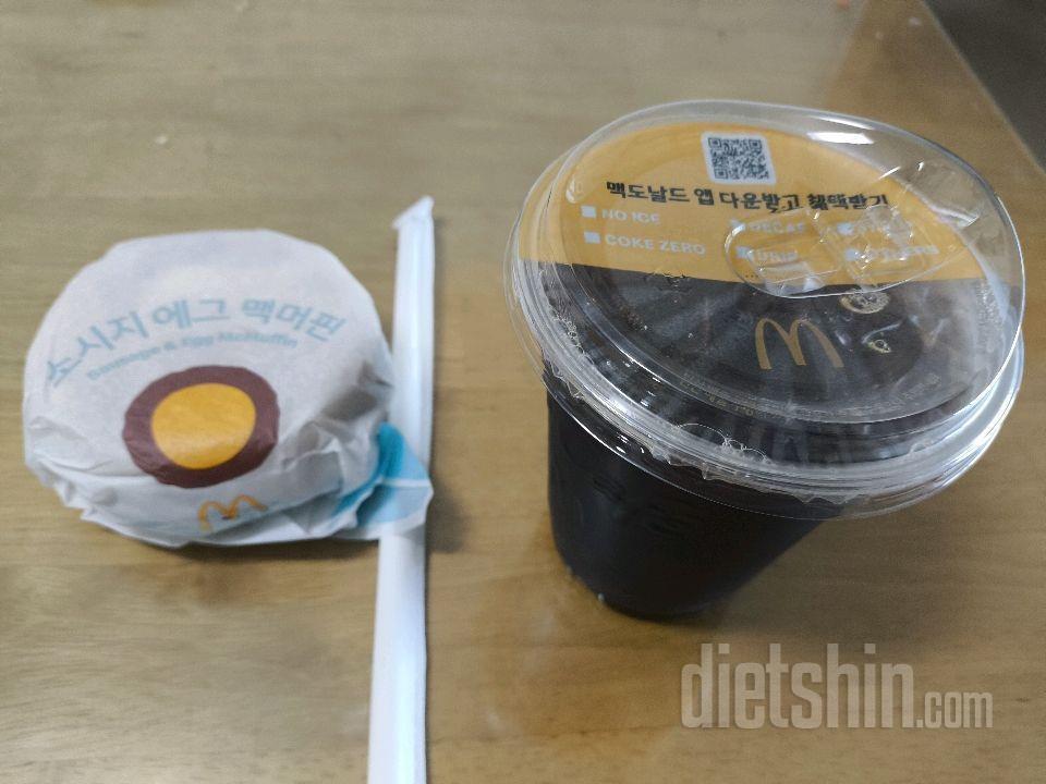 아침식사: 소시지에그 맥머핀1개, 아이스 드립커피1잔, 아메리카노1잔, 100퍼센트 땅콩버터1티스푼