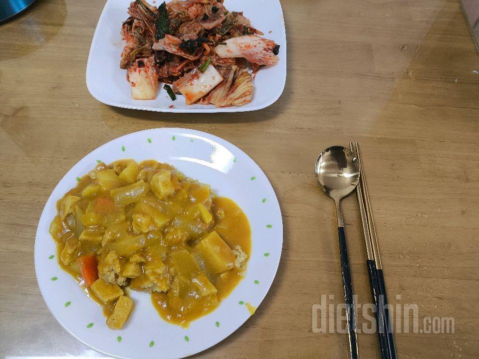 저녁식사: 돼지고기 카레라이스1인분, 겉절이 적당량, 스테비아 방울토마토7개, 생강차1잔