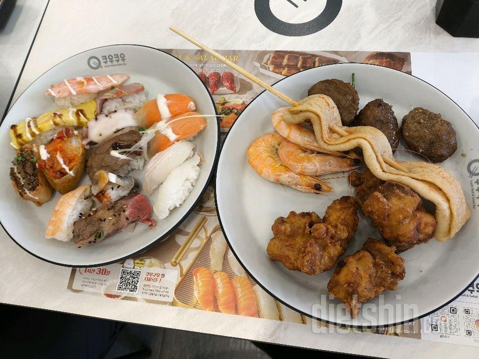 점심식사: 작은 초밥13조각, 후라이드치킨4조각, 떡갈비3조각, 대하찜3마리, 매운 어묵꼬치1개, 깐쇼새우3조각, 버섯 채소볶음 조금, 아구찜2조각, 아메리카노2잔, 제로콜라2잔