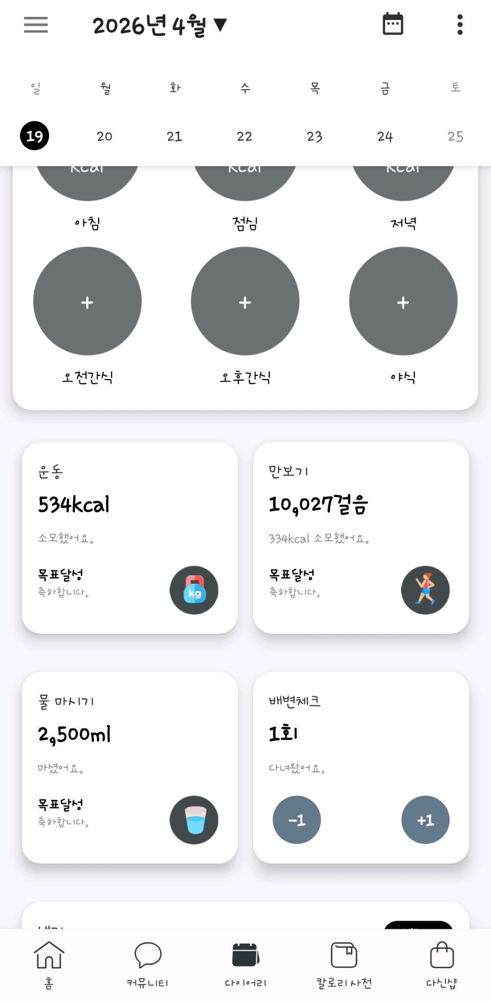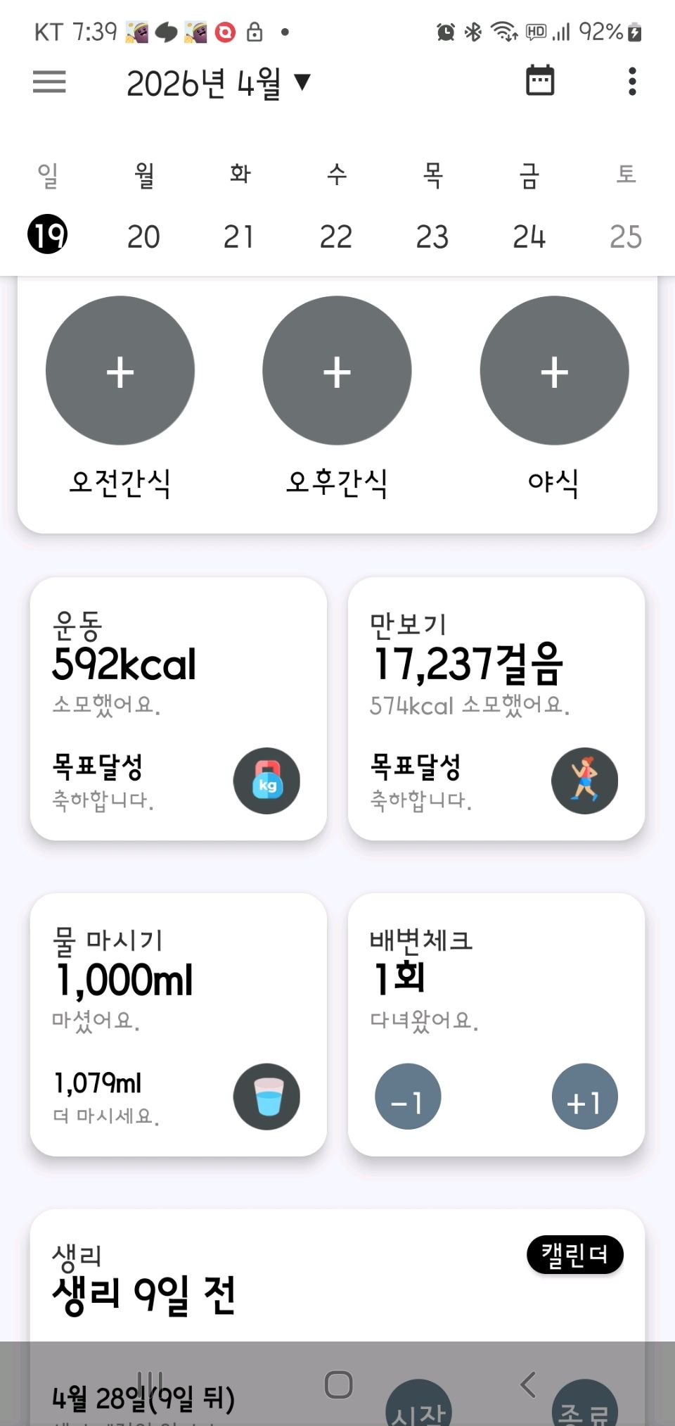 04월 19일 (음식 1126kcal, 운동 400kcal)