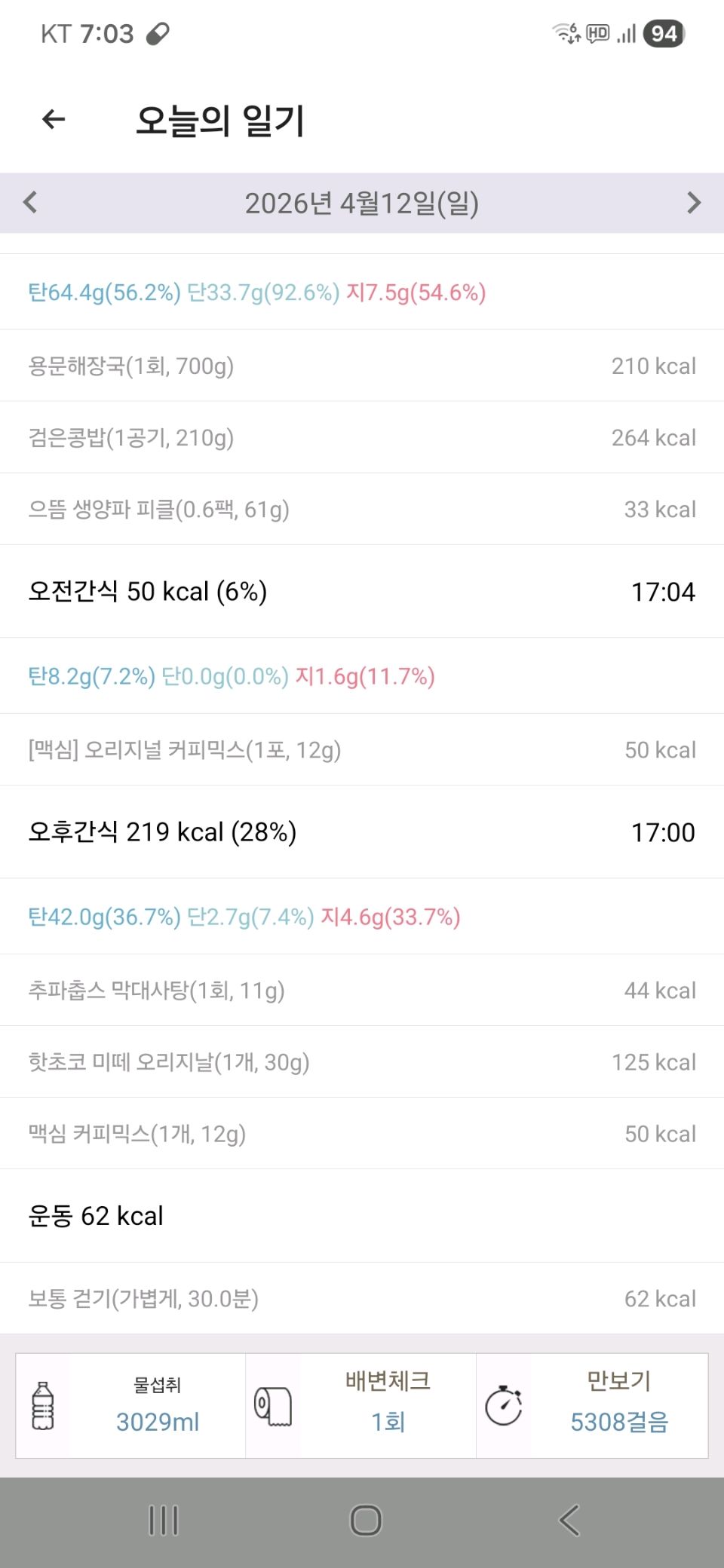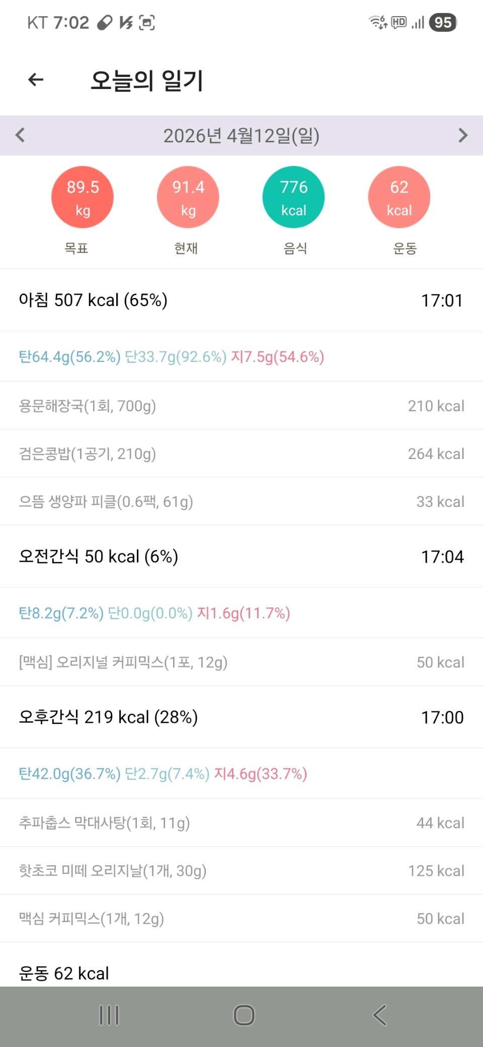04월 12일 (음식 776kcal, 운동 62kcal)