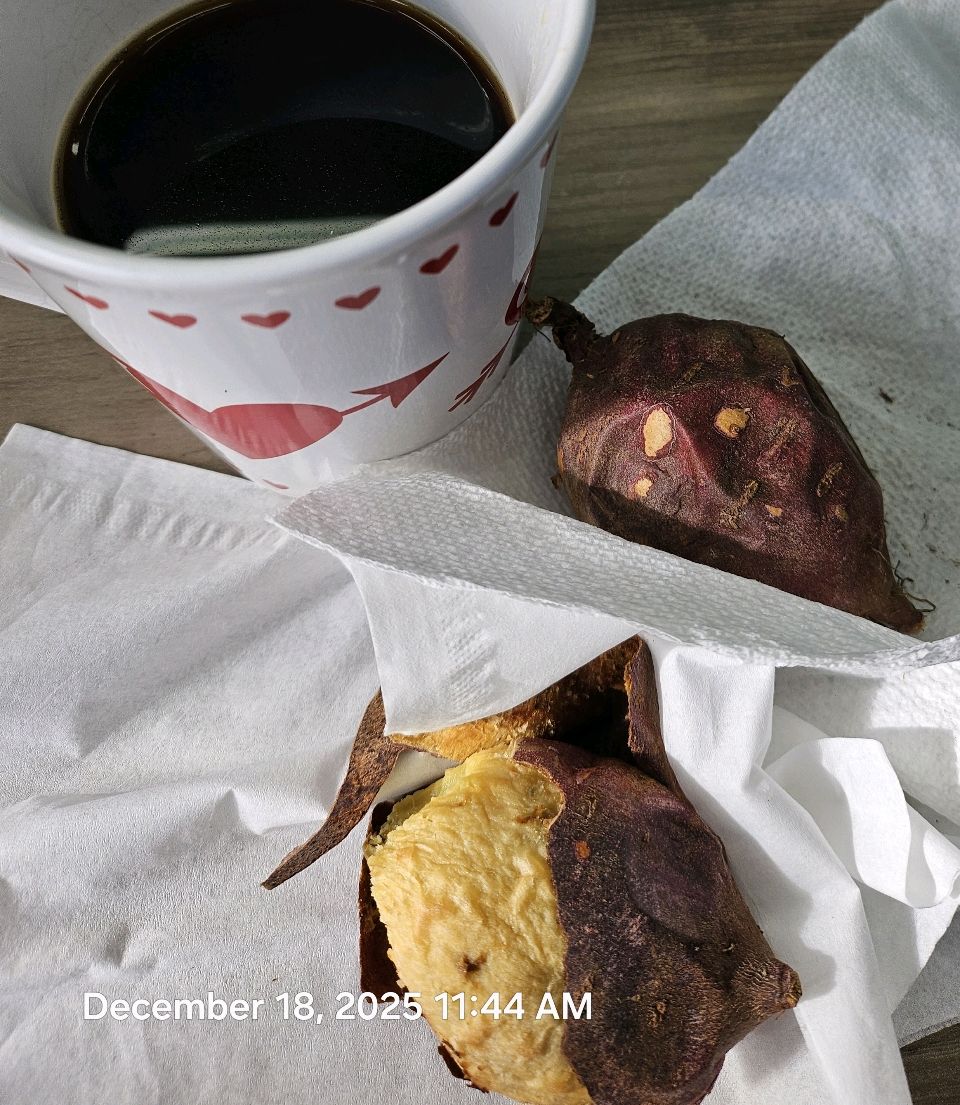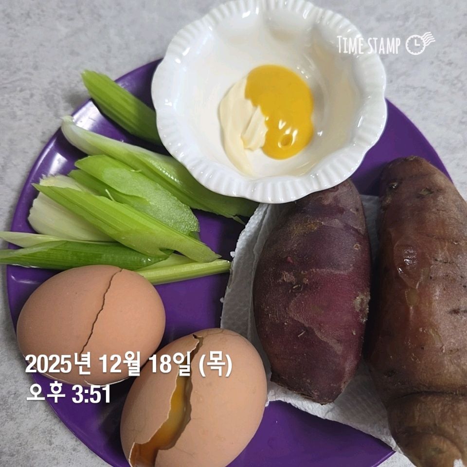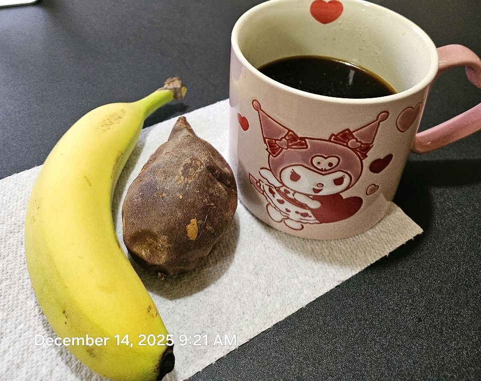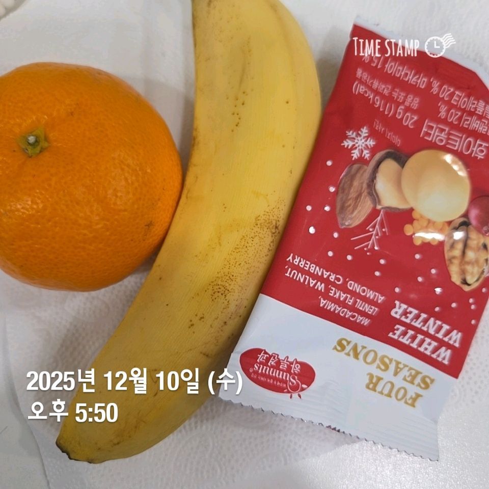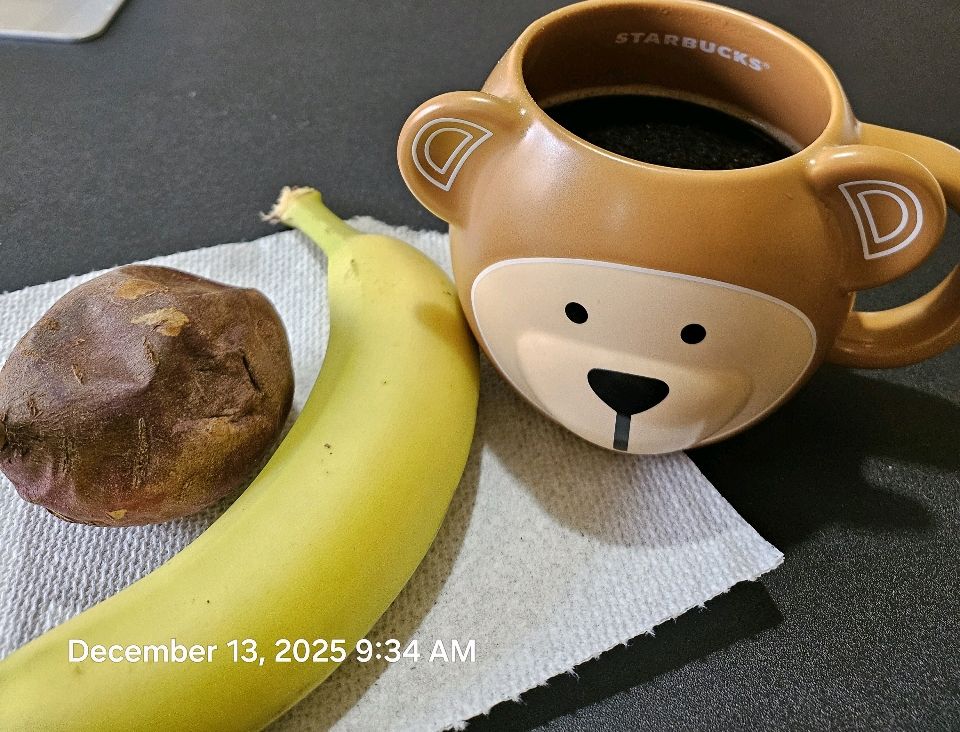 아침: 바나나, 강황커피 점심: 고구마2, 녹차, 사과 저녁: 큐도바볼