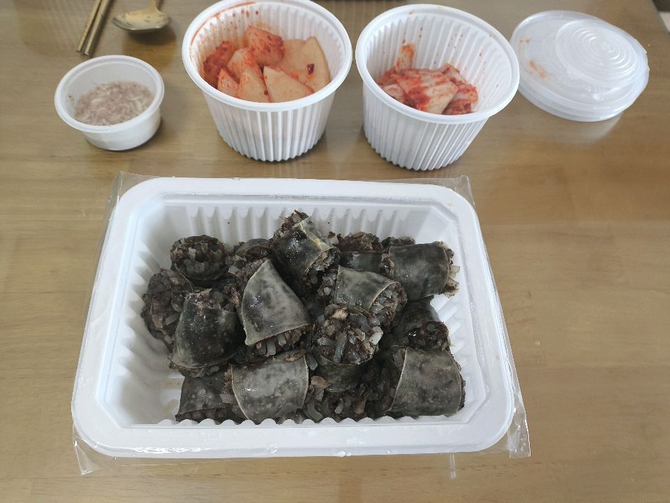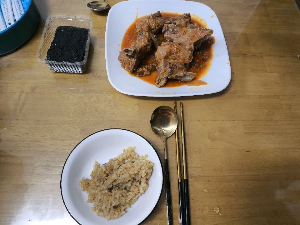 아침식사: 발아현미밥1/2공기, 조미김4장, 돼지갈비찜3조각, 쑥개떡1개