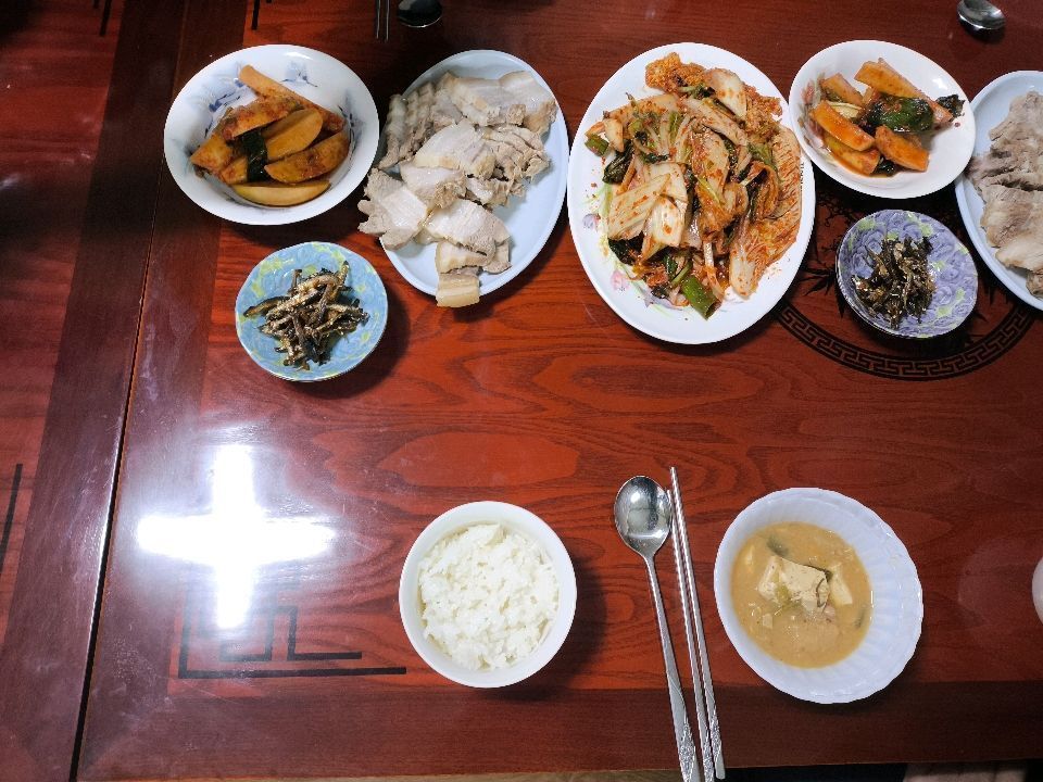아침식사: 쌀밥1/2공기, 콩나물국1그릇, 갈치구이1조각, 배추김치1조각