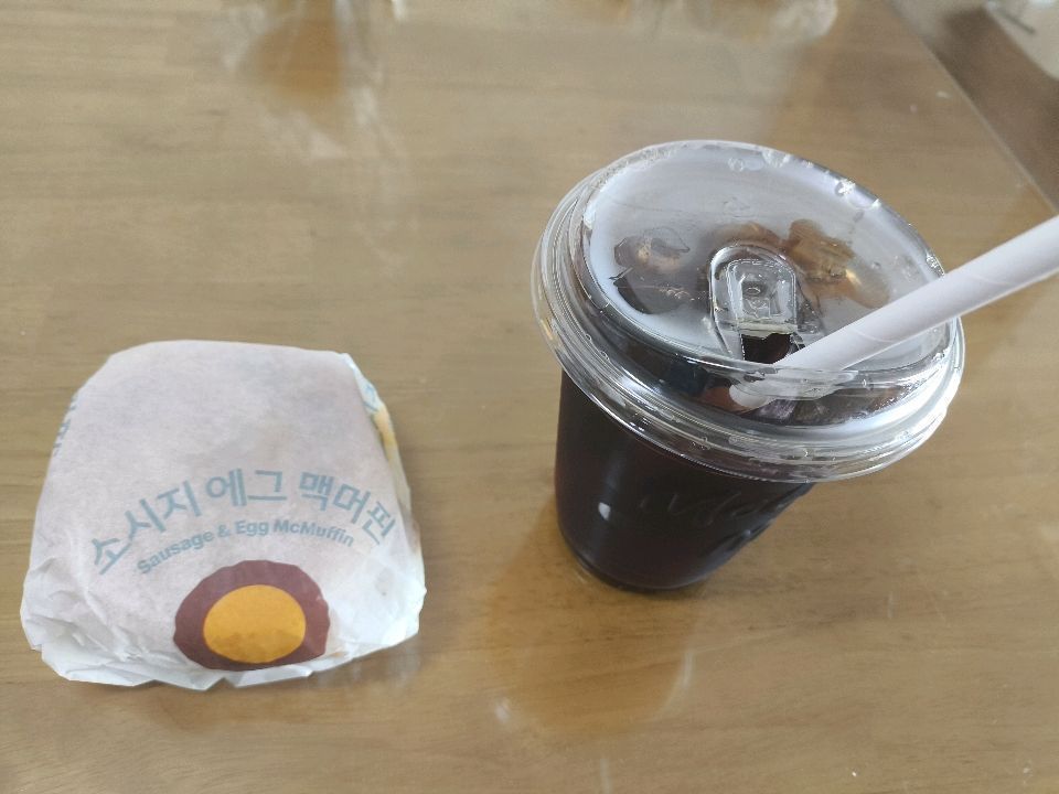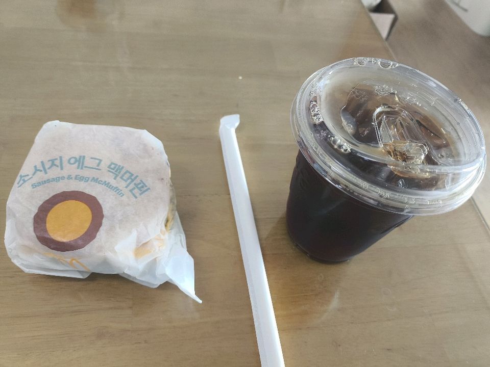 (공체 62.5kg) 아침식사: 소시지 에그 맥머핀1개, 아이스 드립커피